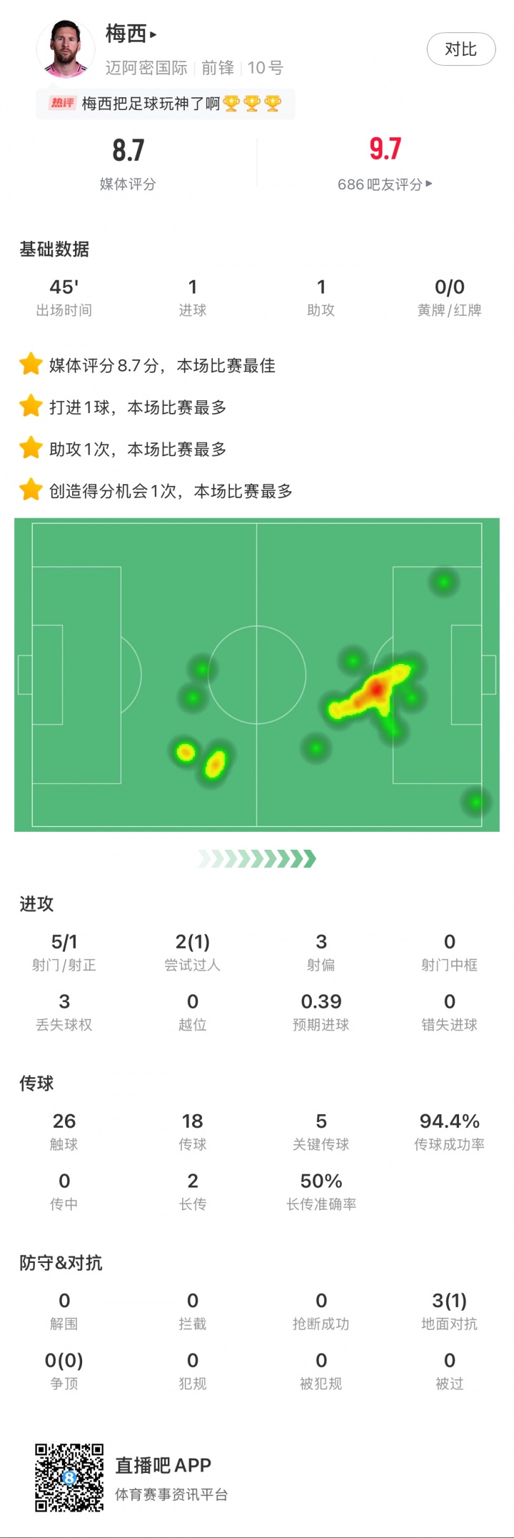 出战45分钟1球1助